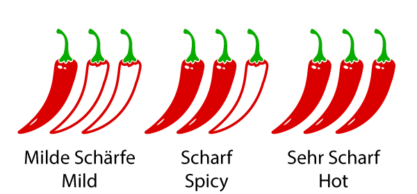 Bei der Zusammenstellung Ihrer Menüs beachten Sie bitte die Angaben zur Schärfe der verschiedenen Gerichte und geben Sie uns bei Ihrer Bestellung an, wie Ihr Gericht gewürzt werden soll:
